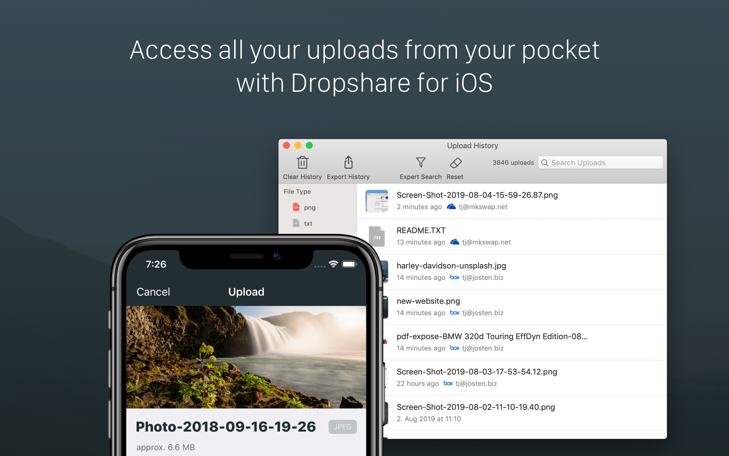 By having access to all your uploads also on-the-go, you can continue to use Dropshare on your iOS device exactly where you left off on your Mac.