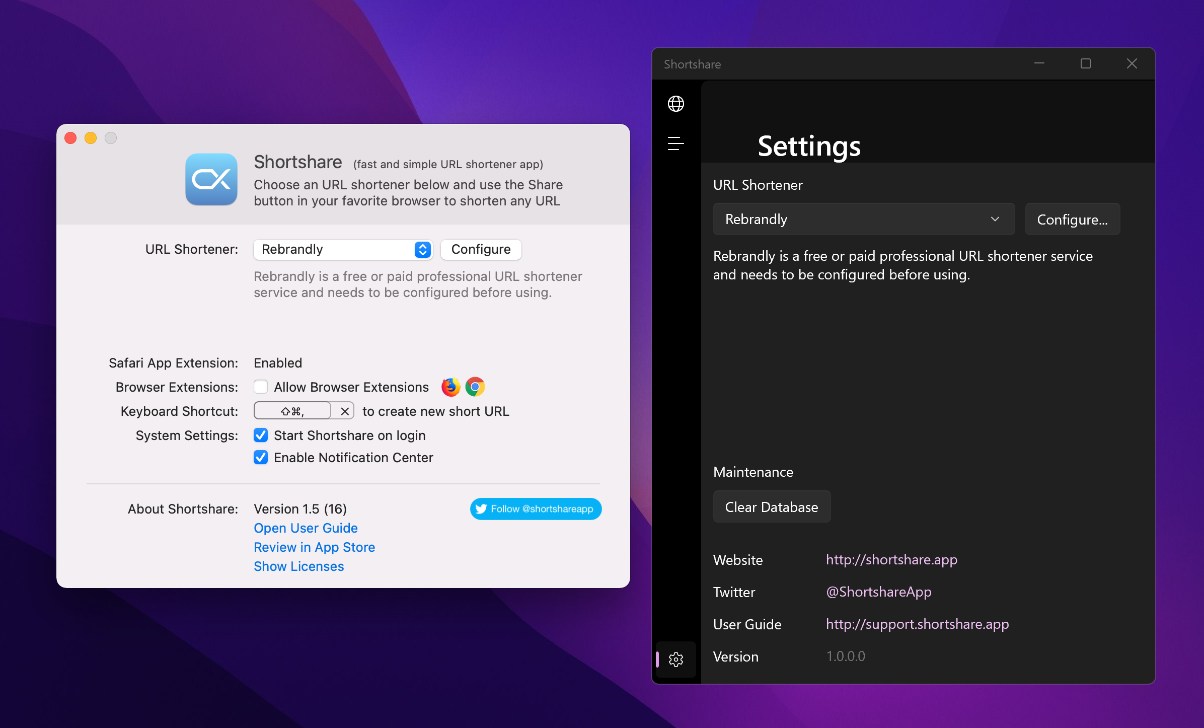 Shortshare is a utility application for URL shortener services. It supports 11 established URL shortener services (Bitly, Rebrandly, Shortio, Tinyurl, Kutt, Is.gd, Hive, Url.rw, Kurze Links, dsh.re) as well as custom APIs and self-hosted solutions like YOURLS. With a Safari App Extension and a Share Extension on macOS, it integrates natively into your workflows. On Windows, you can use the Share menu to send a URL to the app to shorten it.